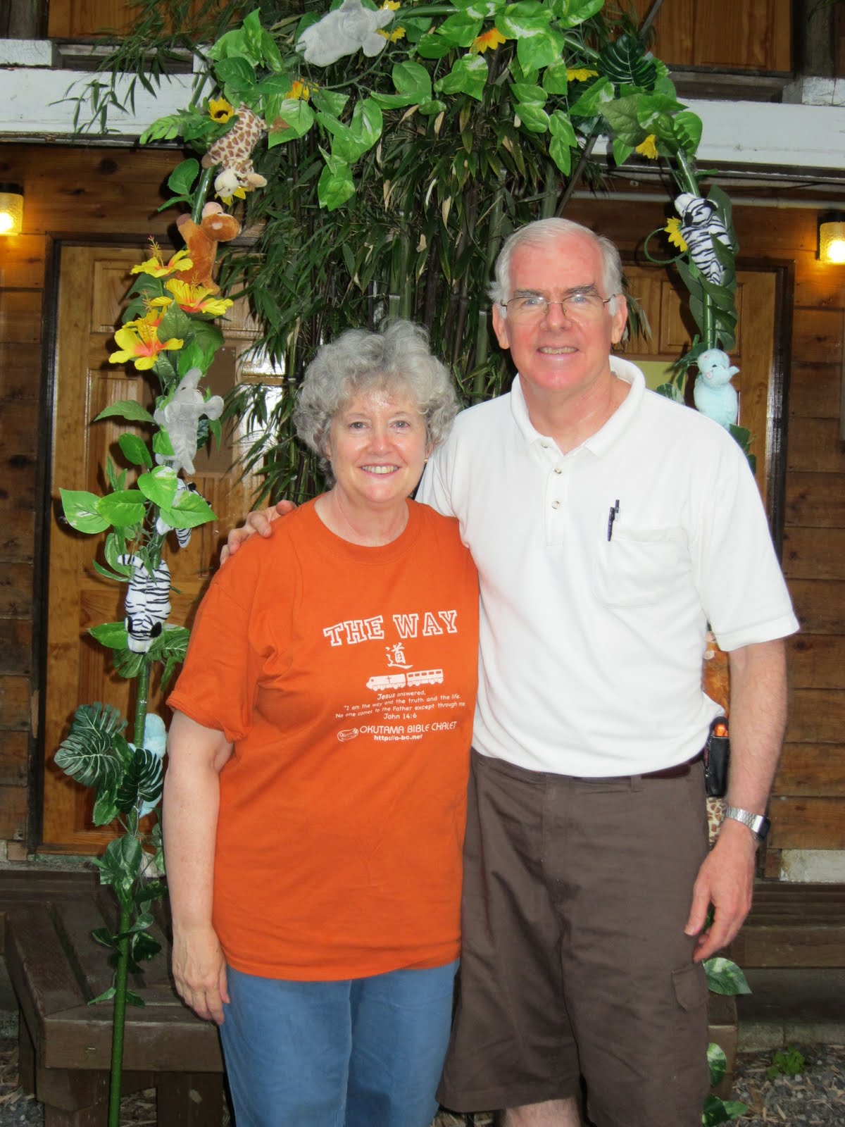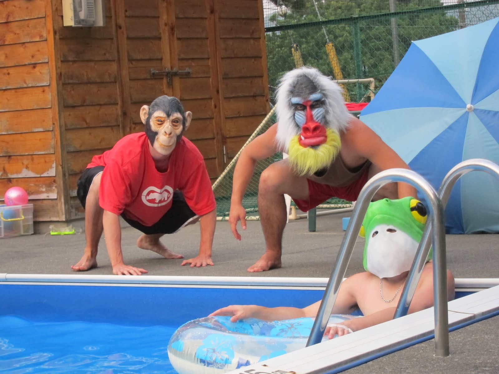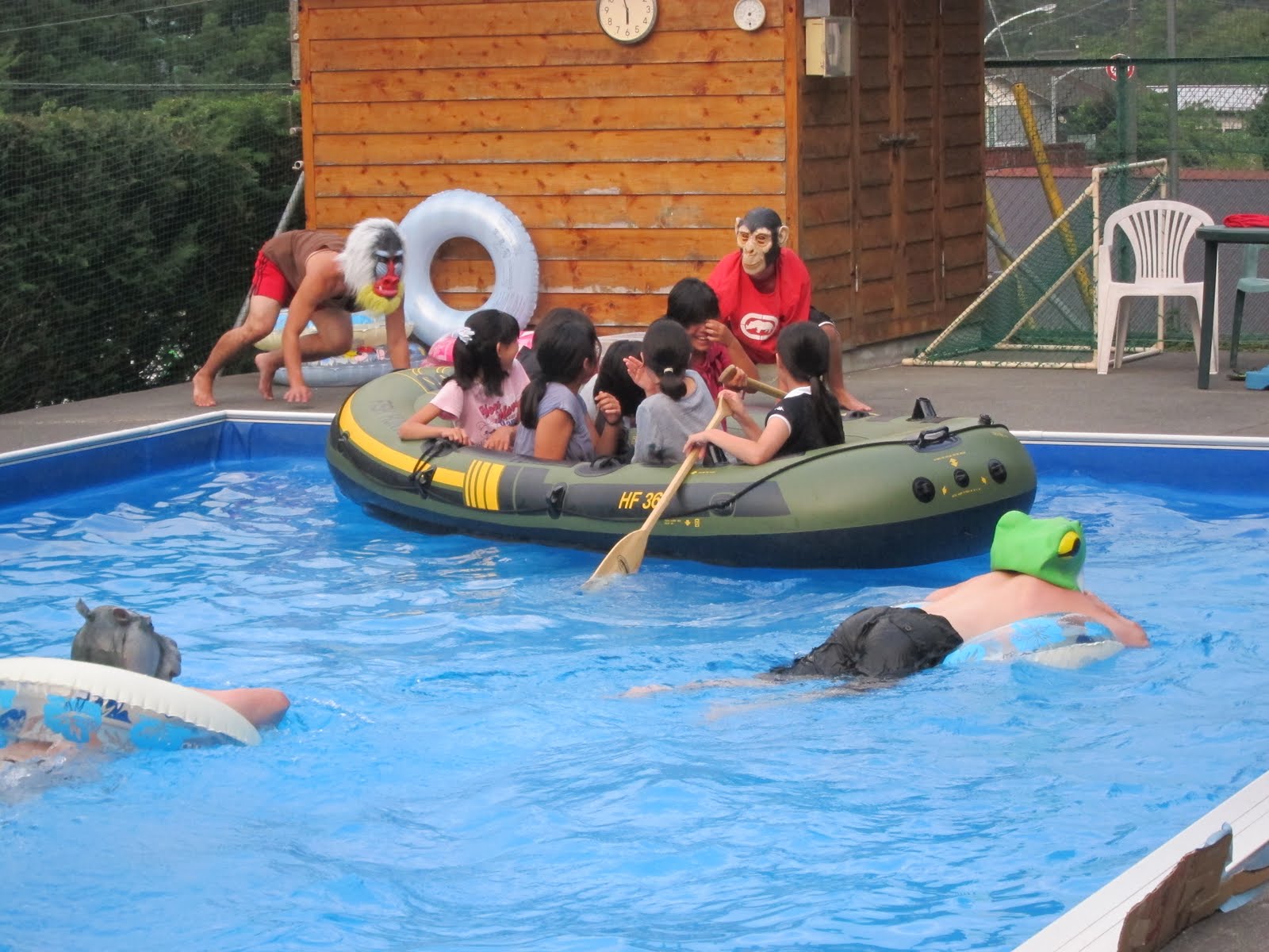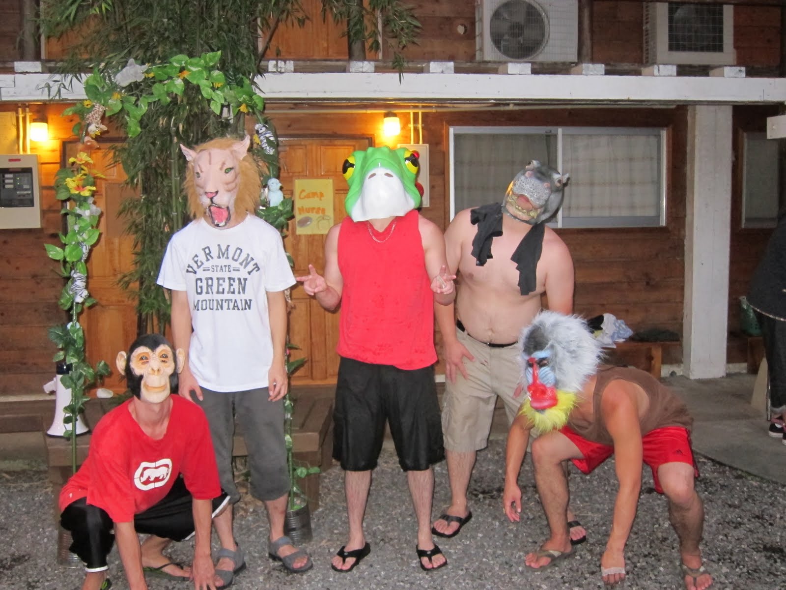 Al and Ev: Final Night at Okutama and the animals come out! Tonight’s dinner was a jungle theme. We decorated the dining room to look like a jungle and each cabin group had to come down to the pool, get in a raft and row to the another side while fighting off a hippo who made big splashes (BJ in a rubber hippo mask), a frog that used a squirt gun and wanted to jump into the boat (Andrew in a rubber frog mask) and a very scary baboon (Tim) who tried to grab you if you got too close to “shore”. We were afraid that the boys would get bonked on the head with a paddle by some of the girls. One girl even stood up to get better aim. Elias Reasoner was also a monkey and he and Tim really moved like a monkey and baboon! The kitchen staff all come out to watch the show. There must have been 8 rafts of kids at least. Those guys were so tired. We had a great dinner of salad, German sausage on a bone, fried boneless chicken, broccoli, corn on the cob, and dirt pudding with a gummy worm for dessert. All the meals have been really delicious – almost like a restaurant than camp food. God has blessed us at Okutama because we really got to serve not just with a servant’s heart but literally as servants – meeting physical needs of believers in Japan by putting aside our comforts and doing hard work. Our wonderful “slave masters” were Laura and Bruce Harris, the director of the camp. The staff at the camp is so dedicated – the cook has been serving for 15 years! Ev learned to crack an egg properly by hitting it against another egg!! It works! After breakfast, we will be heading back to Tokyo area and then to Yokohama to have dinner with the NBF team. It will be so good to see them again. Thank for all your prayers. Al and Ev