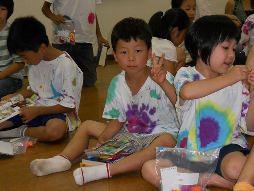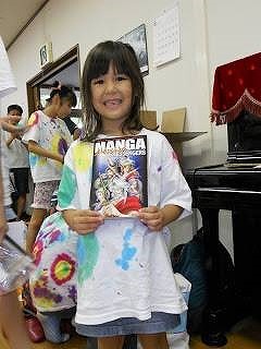 Shirley-NBF Day 5, Last Day of VBS Praise God for a terrific week of VBS at Nokendai Bible Fellowship. We had 21 kids today and were joined by many moms who have come faithfully all week to help and observe. Several dads showed up this afternoon, also to pick up their kids and see what they have been doing all week. We took a group picture at lunch with many of the kids wearing their tie-dyed T-shirts! After a wonderful morning introduction, Mrs. Karen’s experiment depicting sin and turning water into wine, we also had Nozomi-kun’s testimony and an in depth bible discussion in each group and an invitation to say the believer’s prayer, also. We pray for those who checked the box that said they had accepted Jesus Christ as Lord and Savior today! We will do our best to follow-up with each person to encourage them in their new life in Jesus. After lunch, we did marbling paper crafts that turned into beautiful cards complete with envelopes. The kids were still revving up and wanted to continue to do iron-beads and other recreation games, but we just plain ran out of time. We handed out pictures with picture frames, our gift bags and “Messenger” manga bibles, the fifth in the series that starts with “Messiah”.