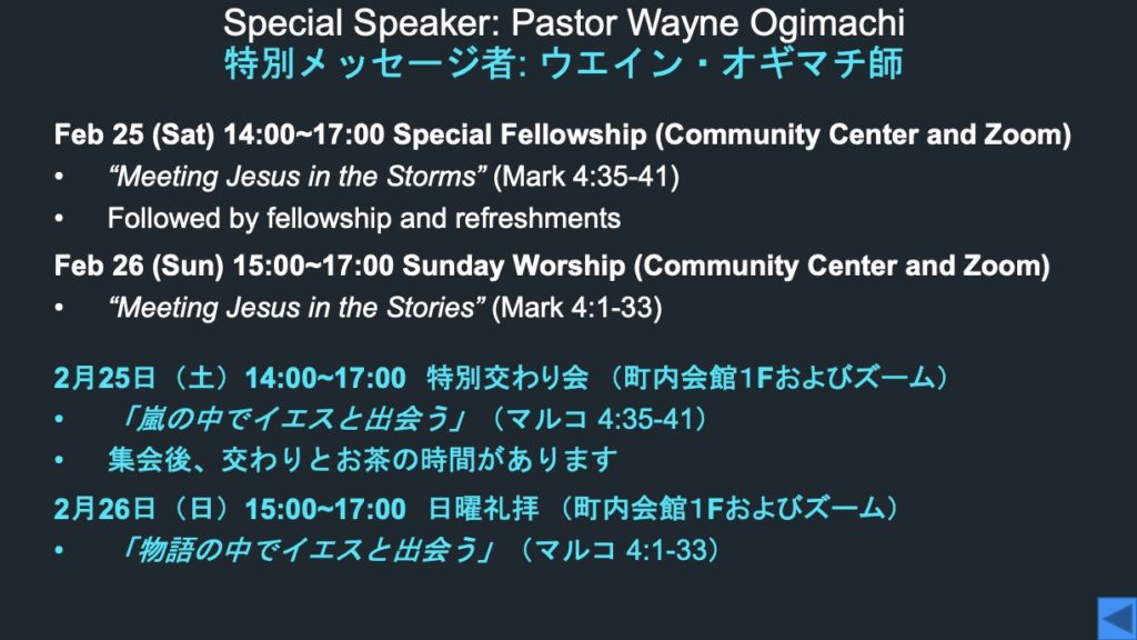 2月25日(土)14:00~17:00 特別交わり会 (町内会館1Fおよびズーム)
